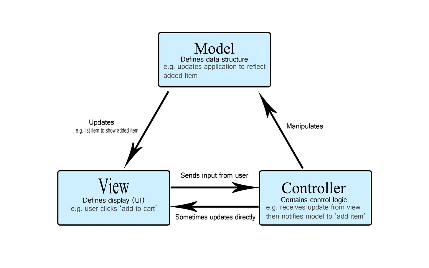 Think of it like a restaurant: the kitchen (Model) prepares the food, the dining room (View) is where customers eat, and the waiter (Controller) takes orders and communicates between the two. This separation allows developers to modify one part without breaking the others.
