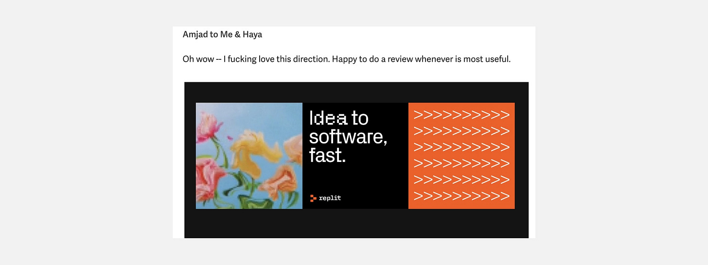 During my time at Replit, I had the honor of rebranding the company at a crucial time for the company. The problem we were facing was the brand perception of Replit as a hobby app or toy, and the shift to professional software makers with AI. Much of the churn and adoption was the perceptions of the brand and discoverability of AI.