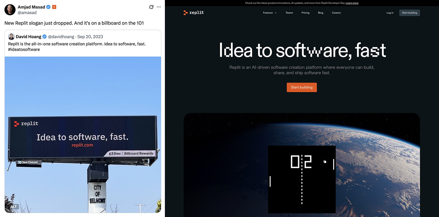 The original tagline, “Idea to software, fast,” spoke to the speed and immediacy of Replit. Over time, it evolved to Idea to app, fast, which I didn’t mind. In an era of vibe coding and instant prototyping, “app” felt more accessible to customers than “software.” But the spirit was the same: Replit helps you go from spark to shipping with unprecedented velocity—something AI only accelerated.