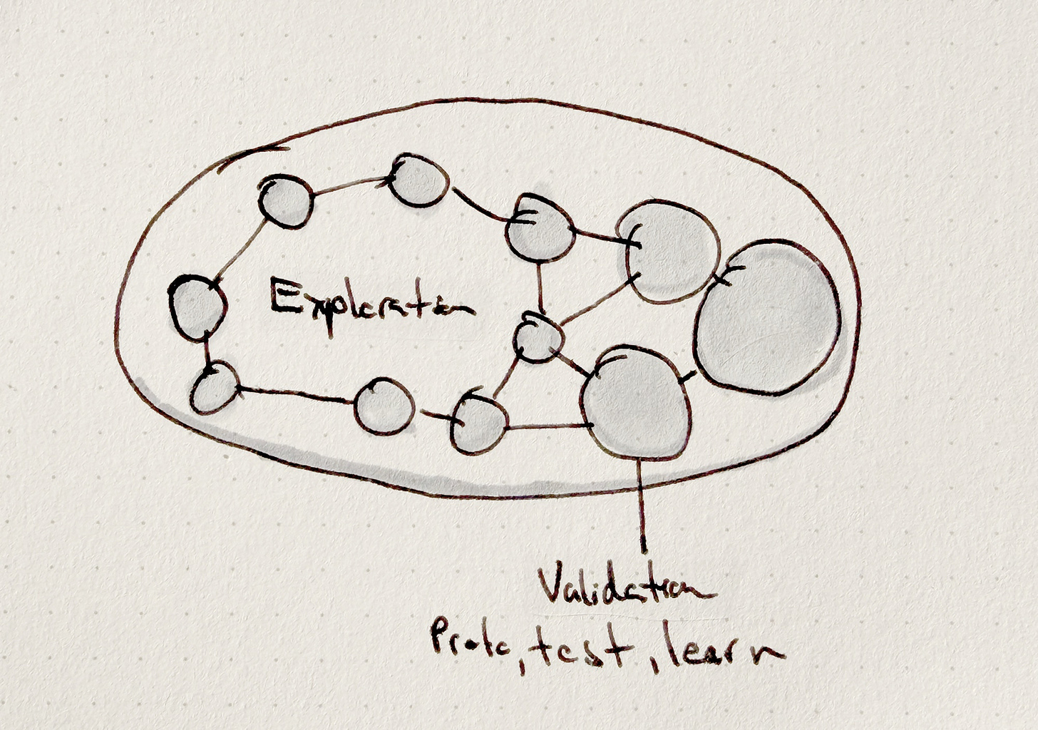 Validation of the Solution Space — the convergent phase, where you test assumptions. You prototype to make ideas tangible, test with real users to gather evidence, and learn to inform what’s next. This loop is about closing in onthe truth.