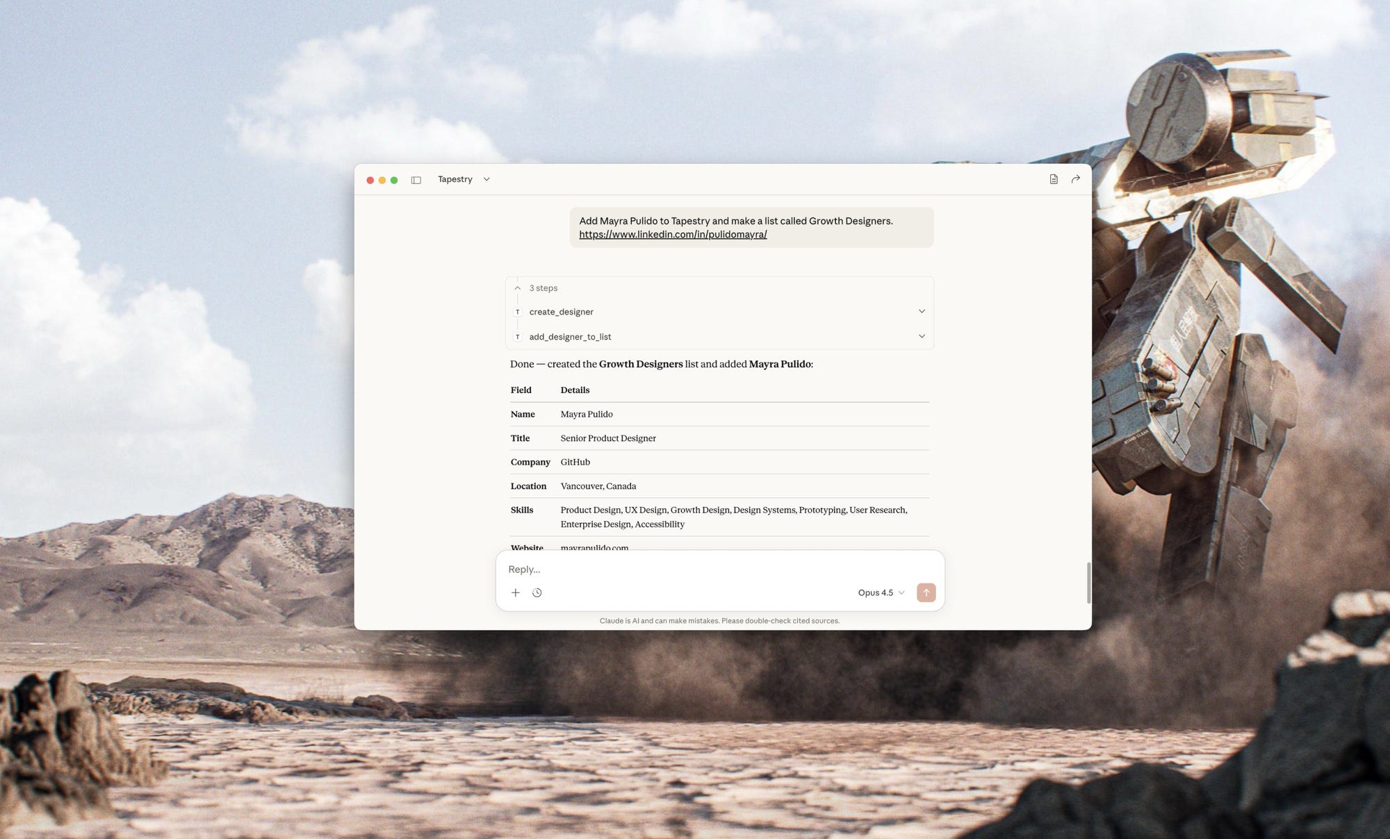 I invited a few people to use it. I got feedback in a production environment—real data, real usage patterns, plus their qualitative feedback. From those insights, I’m now pivoting Tapestry to be more decoupled from the CRUD app. The focus is shifting to a service and an MCP server so people can use their LLM of choice to manage their relationships.