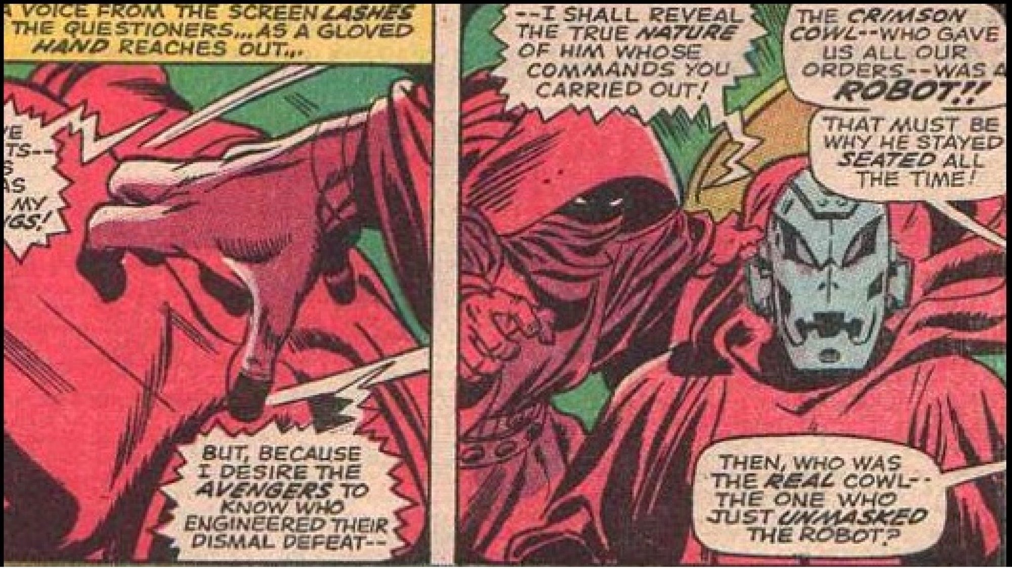 In The Avengers #54, a mysterious villain called the Crimson Cowl is orchestrating attacks against the team. It’s not until the last page that the cowl drops and we see what’s underneath: a robot. The next issue reveals him fully—Ultron-5, a living automation built by Hank Pym using his own brain patterns.